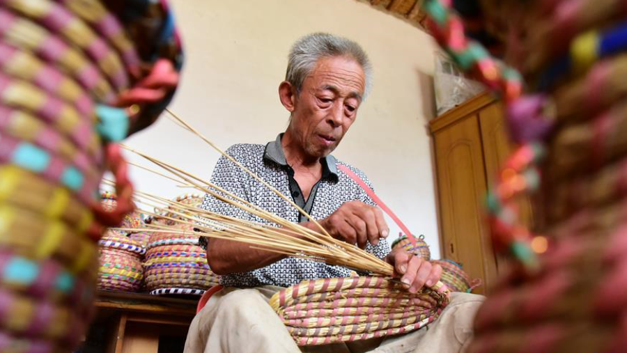 8月2日,楊振國在家中編制草編工藝品。今年61歲的楊振國是魯新寨村草編技藝傳承人,自幼跟隨父親學(xué)習(xí)草編制作技藝。