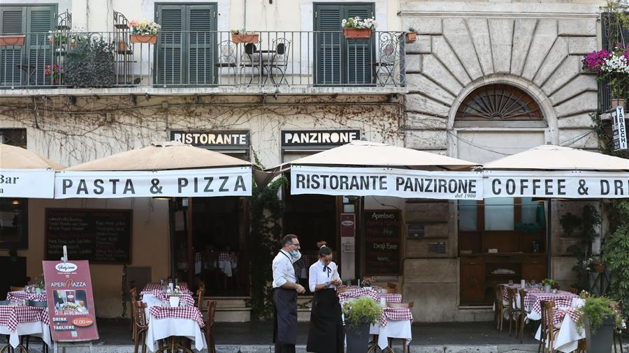 8月4日,人們?cè)谝獯罄锥剂_馬一家餐廳用餐。受新冠疫情影響,今年夏天羅馬的歷史中心區(qū)游客比往年明顯減少。