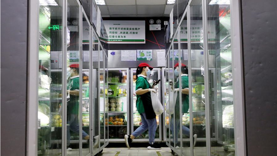 工作人員在新發(fā)地批發(fā)市場(chǎng)周轉(zhuǎn)新區(qū)對(duì)進(jìn)場(chǎng)車(chē)輛進(jìn)行取樣。