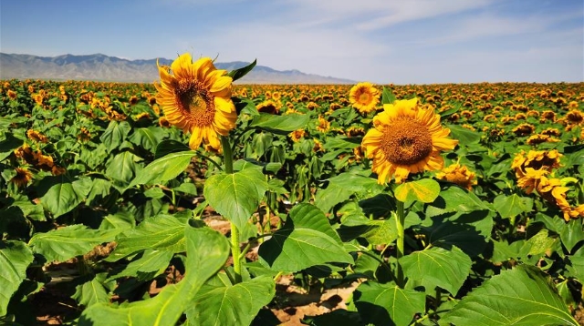 初秋時(shí)節(jié),位于甘肅省白銀市景泰縣寺灘鄉(xiāng)的十萬(wàn)畝向日葵競(jìng)相綻放,金黃的葵花張開(kāi)“笑臉”,迎接豐收。