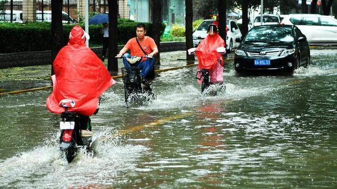 河北石家莊遭遇暴雨 道路積水民眾涉水出行