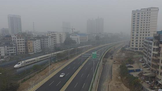 當(dāng)日,廣西南寧市遭遇大霧鎖城。彌漫的大霧讓遠處的建筑物若隱若現(xiàn),也讓不少出行的市民戴上了口罩。