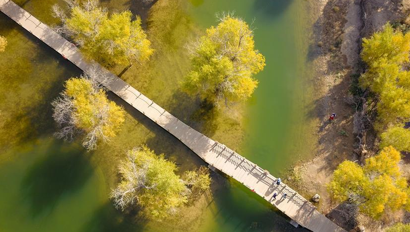 金秋時節(jié),位于內(nèi)蒙古阿拉善盟額濟納旗境內(nèi)的胡楊林披上了金黃色的外衣,在陽光的照射下呈現(xiàn)絢麗奪目的色彩,成為沙漠深處的一抹亮色。