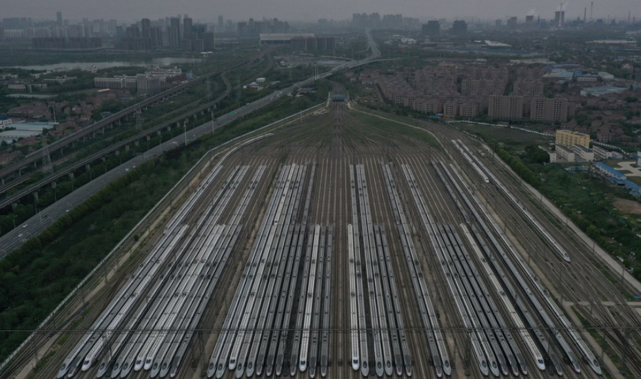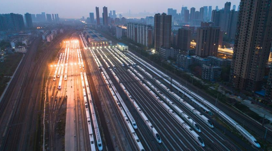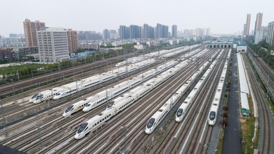 2020年4月6日,武漢動車段高鐵動車組整裝待發(fā)(無人機(jī)照片)。