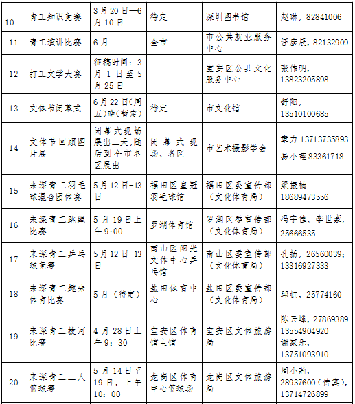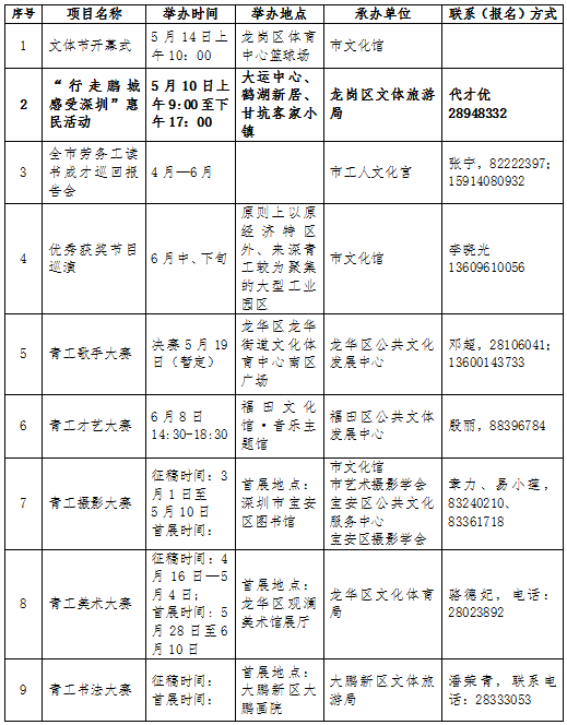 此外,在文體節(jié)期間,全市各級(jí)文化、體育部門(mén)還將廣泛開(kāi)展豐富多彩的文藝演出、比賽、展覽、聯(lián)誼、趣味體育、送書(shū)送戲送電影到工廠等活動(dòng),豐富文體節(jié)的內(nèi)容,滿足廣大來(lái)深青工的文體生活需求。目前,全市勞務(wù)工讀書(shū)成才巡回報(bào)告會(huì)、青工美術(shù)大賽已于本月啟動(dòng)將持續(xù)至6月,來(lái)深青工拔河比賽則將于4月28日在寶安體育館開(kāi)賽。