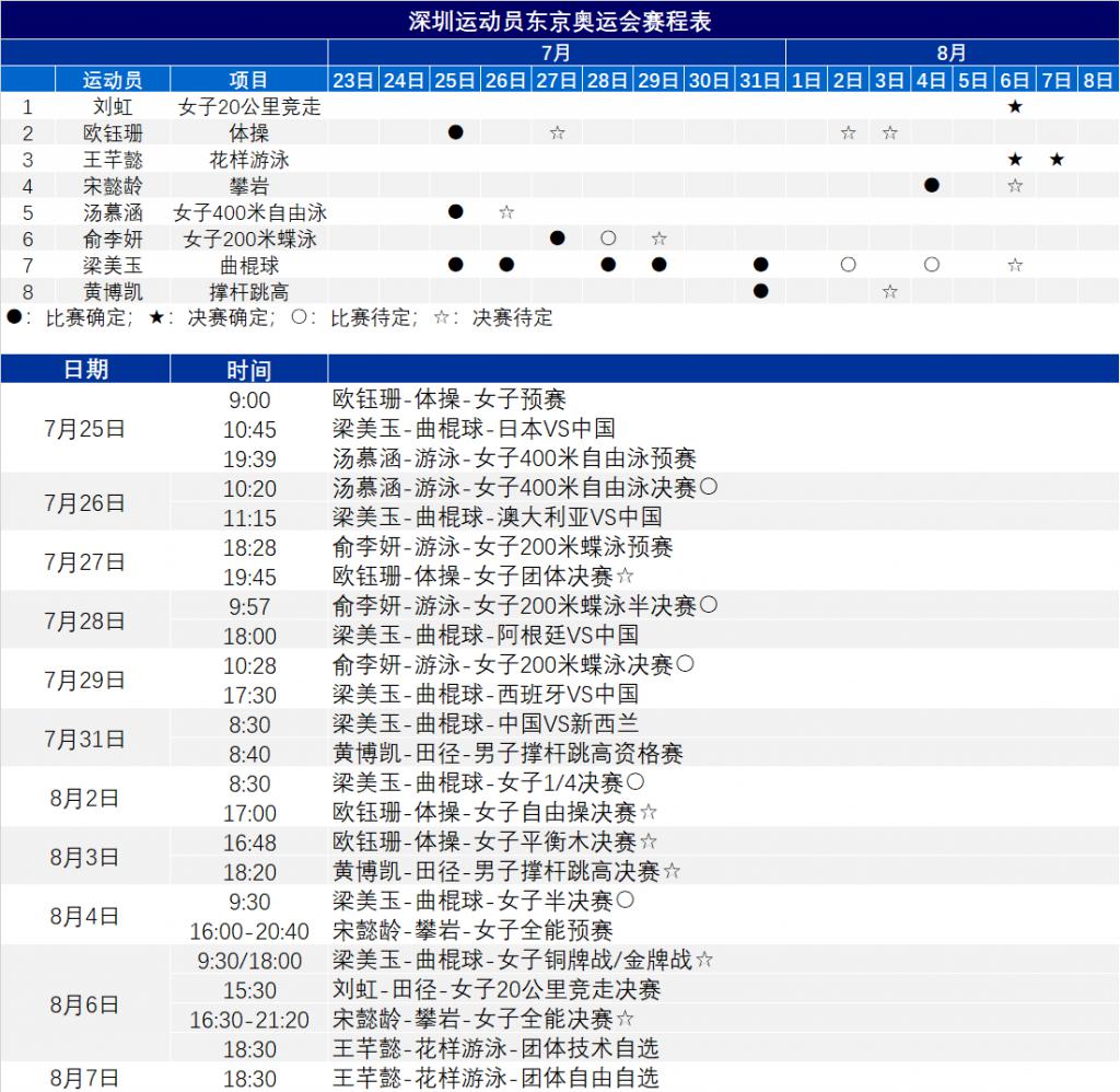 7月19日,深圳市文化廣電旅游體育局整理公布了深圳健兒在東京奧運(yùn)會(huì)上的比賽日歷。
