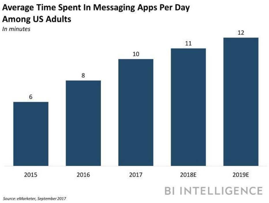 據(jù)市場研究公司eMarketer的統(tǒng)計數(shù)據(jù)顯示,去年,美國消費者平均每天在一款通訊應(yīng)用上逗留的時間是10分鐘,較2016年的8分鐘增長了15.2%。這個平均逗留時間在今年有望增長到11分鐘,在2019年有望增長到12分鐘。