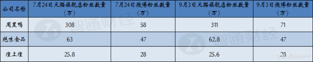 智通財(cái)經(jīng)APP曾在7月24日統(tǒng)計(jì)得到周黑鴨在當(dāng)天的天貓旗艦店粉絲數(shù)量為308萬,是其他兩大鹵制品公司的數(shù)倍,截至9月3日,周黑鴨天貓旗艦店的粉絲數(shù)量已經(jīng)增長(zhǎng)至311萬,反觀絕味和煌上煌不僅沒有增長(zhǎng)反而有小幅下滑。此外,周黑鴨微博粉絲數(shù)量在9月3日也增長(zhǎng)至71萬較7月27日增長(zhǎng)了13萬,而其他兩家公司的微博粉絲數(shù)量還在原地踏步。