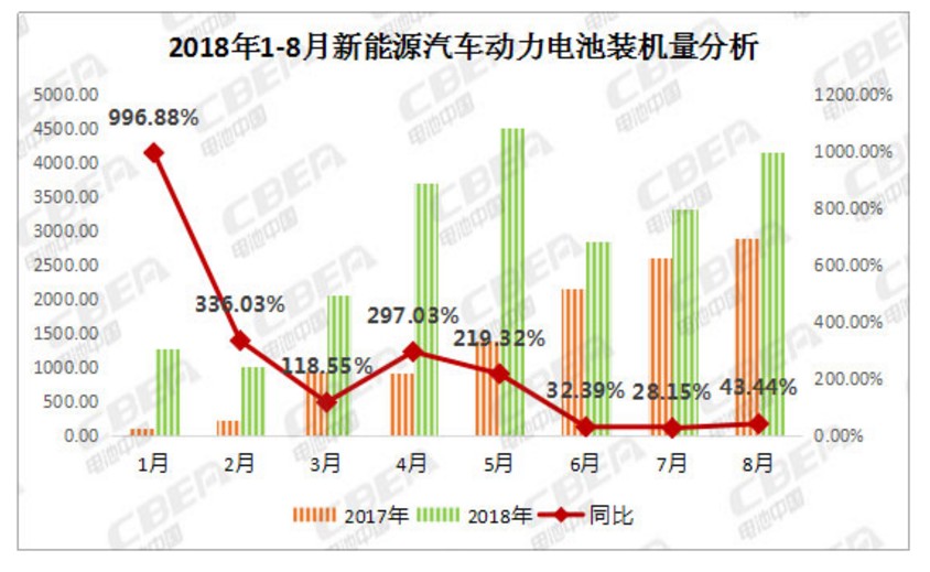 據(jù)動力電池應(yīng)用分會研究部分析數(shù)據(jù)顯示,2018年8月,我國新能源汽車動力電池裝機(jī)量約4.17Gwh,環(huán)比增長25%,同比增長43.44%;1-8月累計裝機(jī)總量約22.97Gwh。