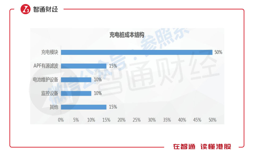 充電樁的上游是零部件的供應商,主要為電池維護設(shè)備、充電模塊、監(jiān)控設(shè)備等,而充電樁的成本構(gòu)成中,充電模塊占比達50%,充電模塊、監(jiān)控設(shè)備及電池維護設(shè)備合計成本占比達到70%,是充電樁的核心成本。