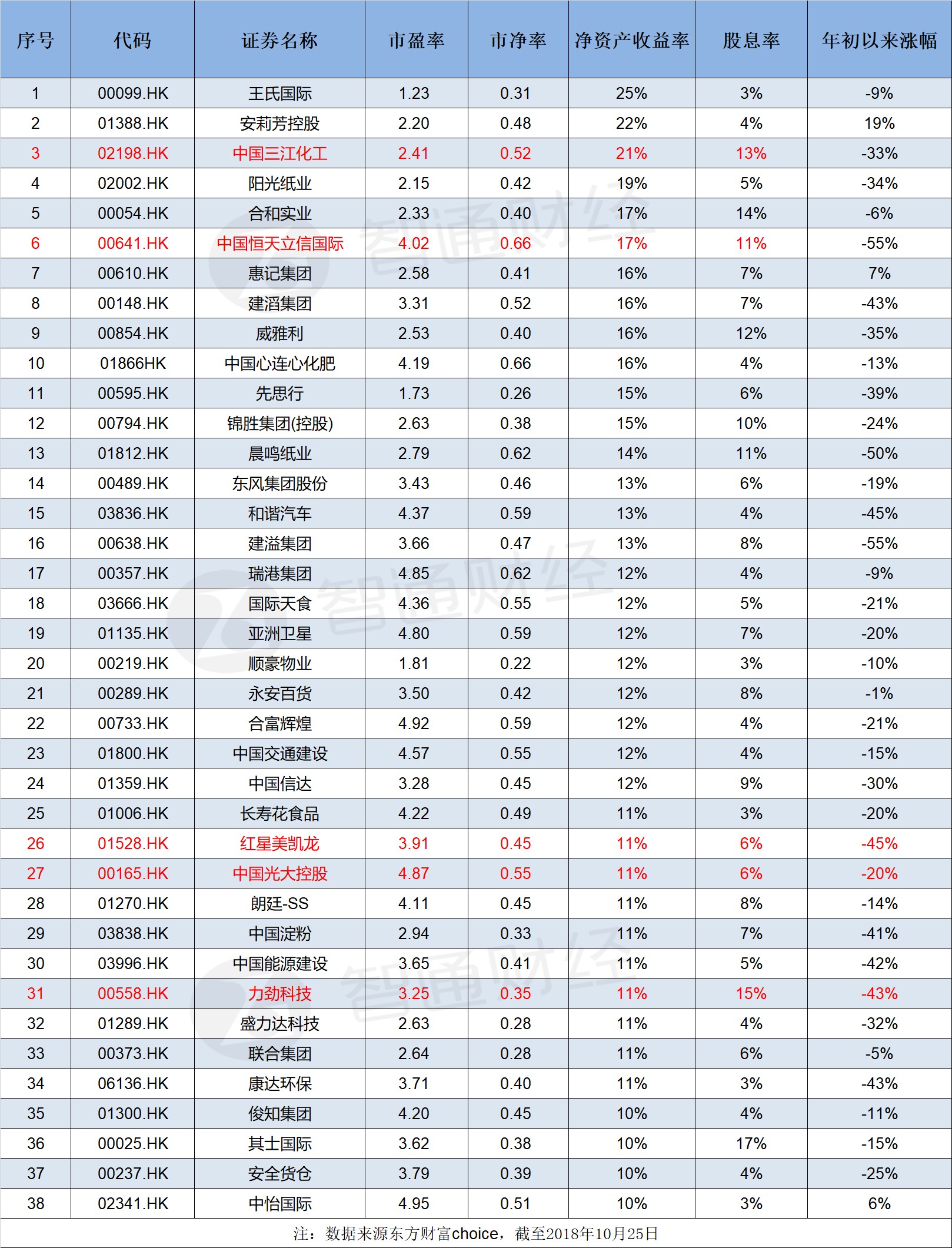 圖表顯示,截止2018年10月25日,從ROE指標(biāo)來看,指標(biāo)比較居前的公司有安莉芳(01388)、中國三江化工(02198)、合和實(shí)業(yè)(00054)。其中,中國三江化工為ROE及股息率雙高個股。