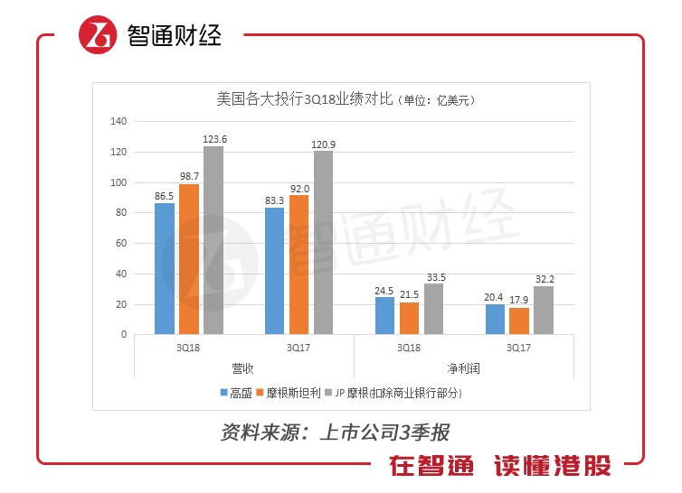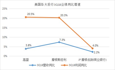 三家投行的3Q18營收增速在所有上市公司中排名靠后,從營收和利潤的同比增速來看,JP摩根都是排名墊底,高盛和“大摩”的利潤增速都超過20%,大大超過利潤增速。