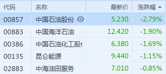 智通財經(jīng)APP獲悉,受國際油價下跌拖累,早盤石油股全線下滑,截至9時38分,中石油(00857)跌2.79%,報價5.23港元,中海油(00883)跌1.9%,報12.42港元,中石化(00386)跌1.69%,報6.38港元,昆侖能源(00135)跌1.15%,報9.44%港元。