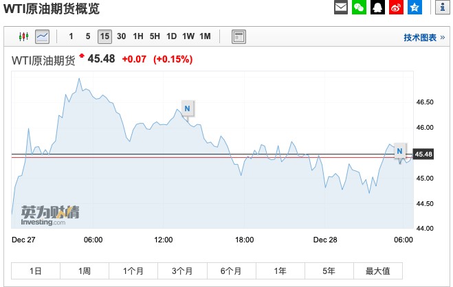 截至發(fā)稿,WTI原油漲0.07美元,漲幅0.15%,報45.48美元/桶。(劉大洋)