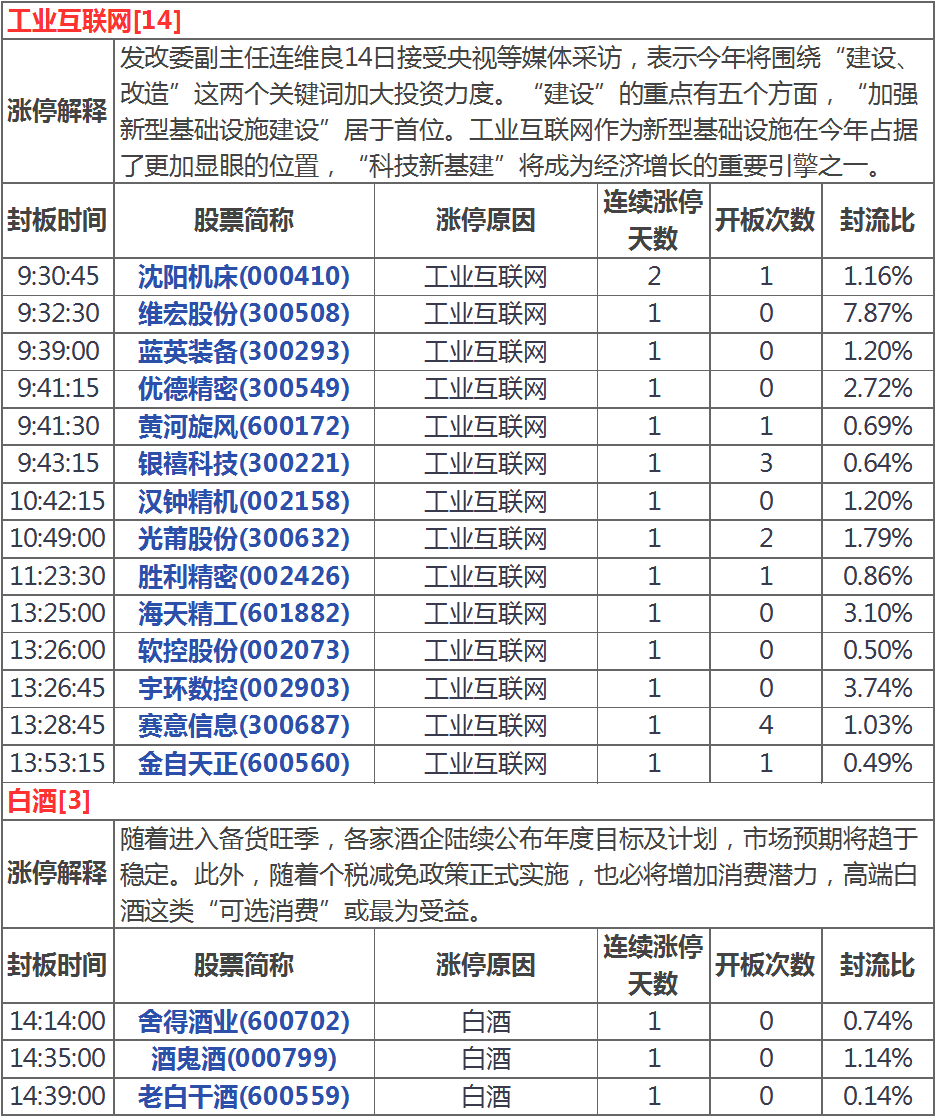 漲停分析:白酒板塊暴力反彈 工業(yè)互聯(lián)網(wǎng)多股漲停(1月15日)