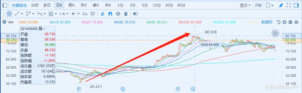 2013年12月4日,工業(yè)和信息化部正式向三大運(yùn)營商發(fā)放了4G牌照。隨后的2014年,見證了4G前期的陣痛和后期的爆發(fā)。也在這一年,中國移動(dòng)股價(jià)上漲了21.32%。