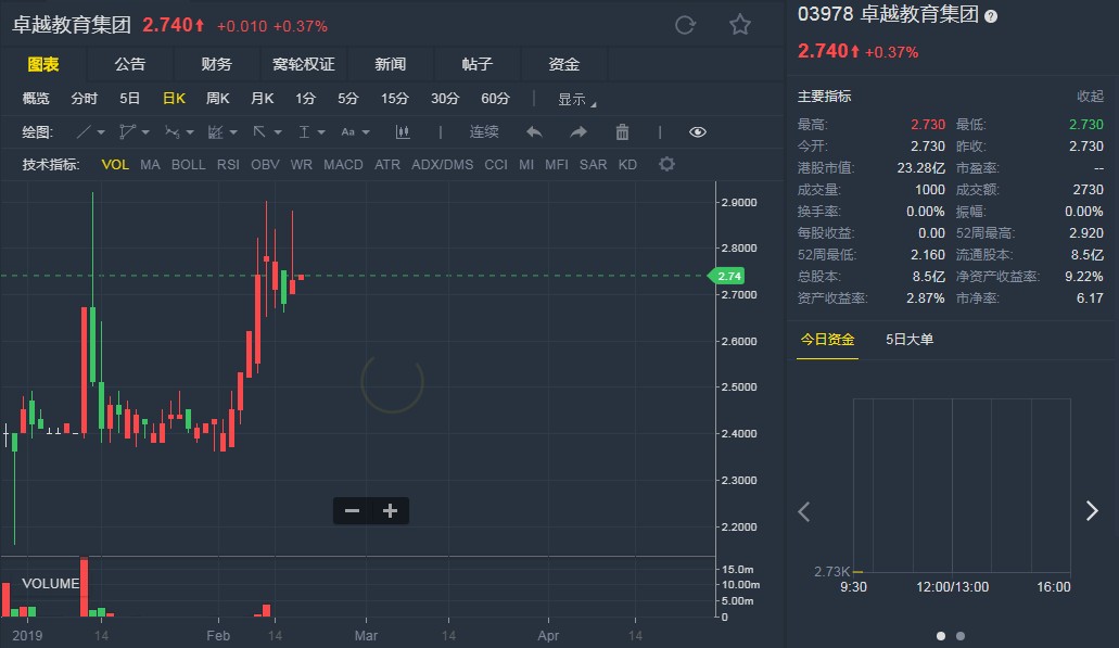 截至發(fā)稿,卓越教育(03978)升0.37%,報(bào)2.740港元。(劉大洋)