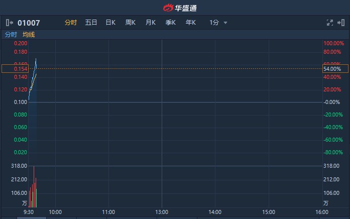 智通財(cái)經(jīng)APP獲悉,龍輝國(guó)際控股(01007)早盤受資金追捧,快速拉升,一度漲70%,截至9時(shí)38分,漲54%,報(bào)0.154港元,成交額達(dá)2218萬港元。
