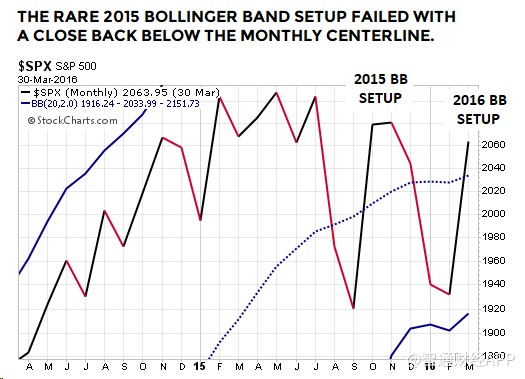 標(biāo)普500指數(shù)從布林通道月線中軌以上跌至中軌以下,然后再反彈收高于中軌以上,并在此期間一直維持在下軌以上,這是標(biāo)準(zhǔn)普爾500指數(shù)相對(duì)少見的走勢(shì),而這正是2018年至2019年發(fā)生的情況。