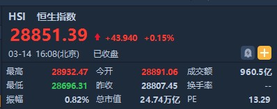 截至收盤,恒生指數(shù)漲43.94點或0.15%,報28851.39點,全日成交額達960.51億。國企指數(shù)漲41.45%,報11447.27點,紅籌指數(shù)漲0.56%,報4513.25點。