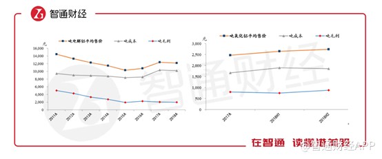 二是因為其產(chǎn)品噸成本居高不下,拿電解鋁來說,2015年之前,隨著售價的明顯下降,噸成本卻保持穩(wěn)定,導致利潤空間被壓縮。新生產(chǎn)品氧化鋁毛利率目前還比較穩(wěn)定,并且高于電解鋁的毛利率。這可能也是氧化鋁業(yè)務(wù)占比迅速擴大的原因。