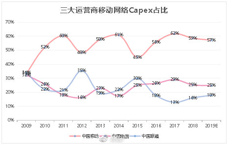 過(guò)去十年,中國(guó)移動(dòng)占比三大運(yùn)營(yíng)商總資本開(kāi)支的范圍基本處于50%-60%區(qū)間,電信占比20-30%,聯(lián)通15%-30%。