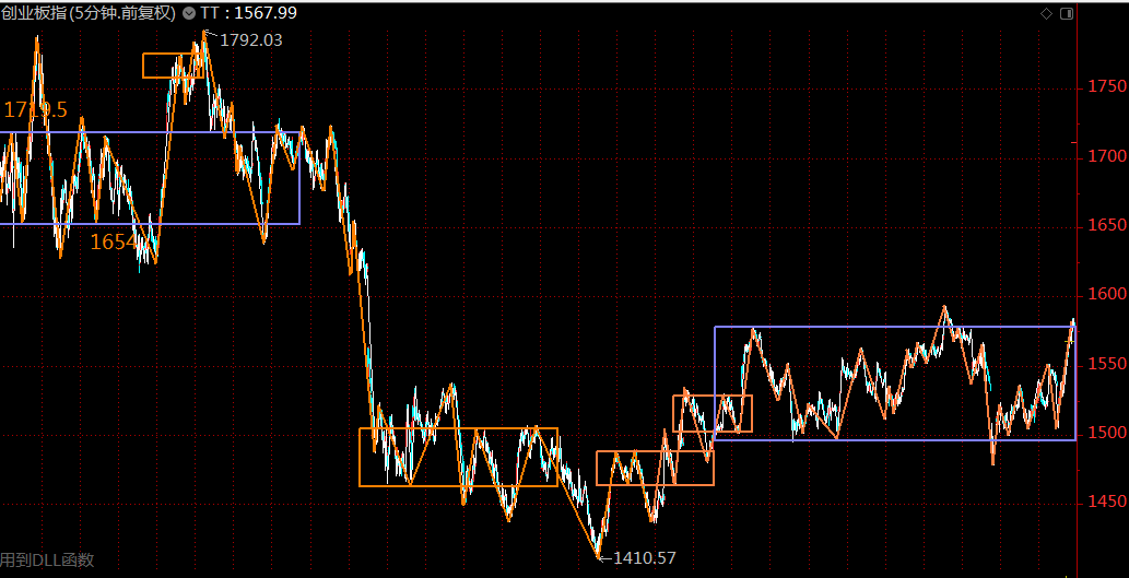 創(chuàng)業(yè)板這里走的比主板強(qiáng)勢很多,周四的陽線直接修復(fù)了形態(tài),目前在三十分鐘中樞內(nèi)部運(yùn)行,中樞上軌1577點(diǎn),周五已經(jīng)頂?shù)搅酥袠猩宪?,如果下周能突破此中樞,等五分鐘回落線段后構(gòu)建三買,可大膽介入做多。