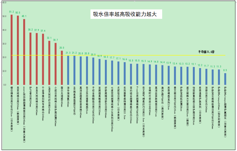 測(cè)試結(jié)果顯示,35款衛(wèi)生巾樣品吸水倍率最高達(dá)到51.2倍(櫻戀綿柔日用衛(wèi)生巾,日本原裝),最低為8.5倍(護(hù)舒寶always超薄護(hù)翼超長(zhǎng),加拿大原裝)。對(duì)于需要解決經(jīng)期量多量大問(wèn)題的女性消費(fèi)者可以?xún)?yōu)先選擇吸水倍率高的衛(wèi)生巾商品。無(wú)論選擇哪種吸量衛(wèi)生巾,婦幼保健醫(yī)生建議,衛(wèi)生巾最佳更換時(shí)間為2-3小時(shí)。測(cè)試結(jié)果詳見(jiàn)下圖。