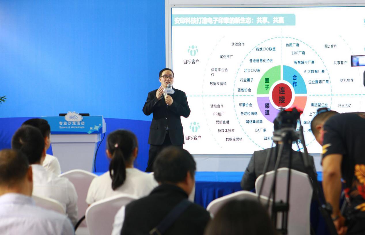 隨后,安印科技營銷副總劉昕發(fā)表了演講,他給大家分享了安印對電子簽章技術(shù)應(yīng)用前景的思考和探索,并對安印電子印章生態(tài)圈進(jìn)行全方位的解讀。劉總表示,對于企業(yè)來說進(jìn)入數(shù)字時代的深遠(yuǎn)影響與沖擊,絕不僅僅是技術(shù)上的創(chuàng)新與突破,更將是一次理念認(rèn)識的徹底洗禮。通過由傳統(tǒng)蓋章模式向互聯(lián)網(wǎng)簽章模式的轉(zhuǎn)變,安印電子印章生態(tài)圈能有效地助力企業(yè)運(yùn)營的提質(zhì)、增效、降本,不斷迸發(fā)出改變與前進(jìn)的力量。