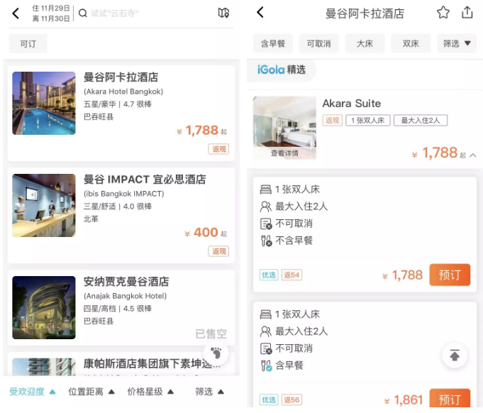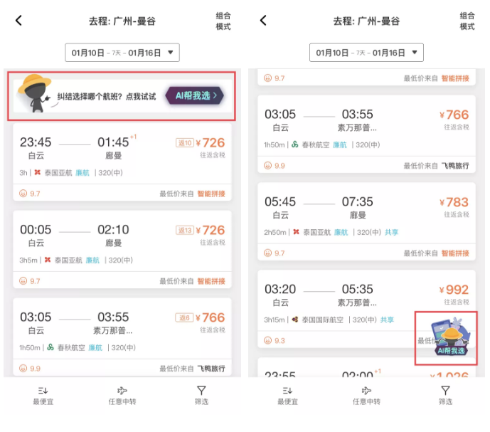 iGola通過AI技術(shù)將傳統(tǒng)的機票搜索頁面中,數(shù)十條的結(jié)果優(yōu)選為5條,通過測試,5條搜索結(jié)果可以基本cover用戶95%的選擇可能。將價格時長航司中轉(zhuǎn)起降時間,設(shè)置為5個維度,以五星維度圖的形式對相關(guān)航旅方案進行直觀的評價,并給出明顯的文字提示,闡明航旅方案亮點。定制內(nèi)容-千人千面,不同需求的乘客(重視價格、重視服務(wù)),會得到不同的搜索結(jié)果。UI設(shè)計與傳統(tǒng)的OTA搜索界面有巨大差異,操作極簡,深受年輕用戶喜歡。