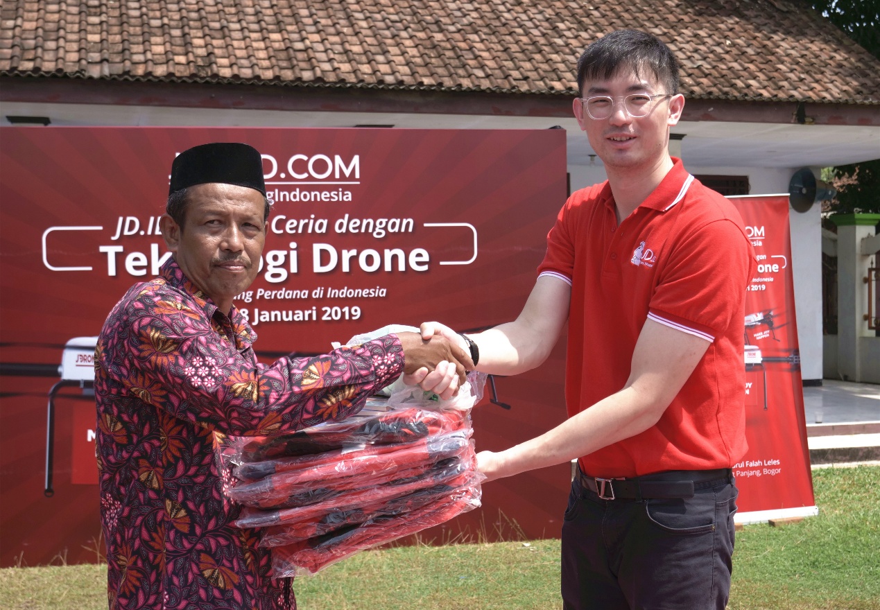 京東印尼 CEO章力(右)將捐贈(zèng)物資交給當(dāng)?shù)匦W(xué)校長(zhǎng)