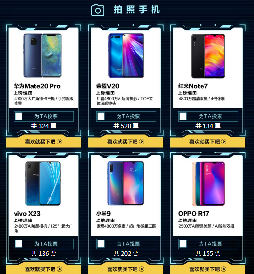 在手機類產(chǎn)品投票中,拍照手機候選產(chǎn)品分別為:華為Mate20 Pro、榮耀V20、紅米Note7、vivo X23、小米9和OPPO R17,截至3月12日榮耀V20暫時領(lǐng)先。