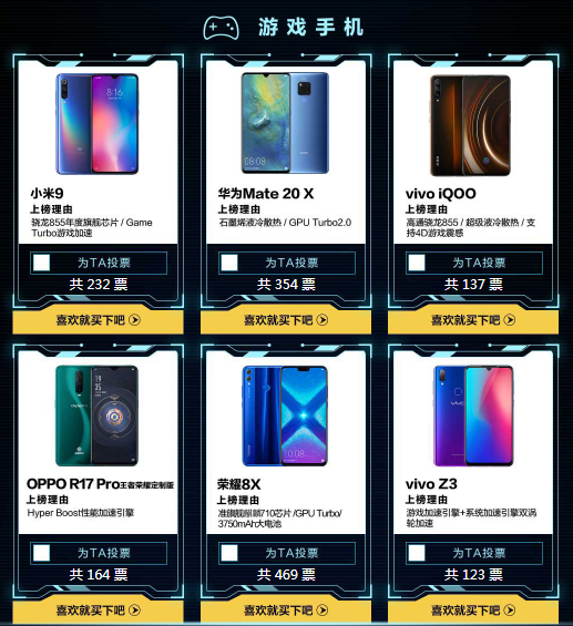 而游戲手機候選產(chǎn)品則包括:小米9、華為Mate20 X、vivo iQOO、OPPO R17 Pro王者榮耀定制版、榮耀8X、vivo Z3六強爭霸,同樣截至3月12日,第一天的投票中,榮耀8X脫穎而出,暫時領(lǐng)先。