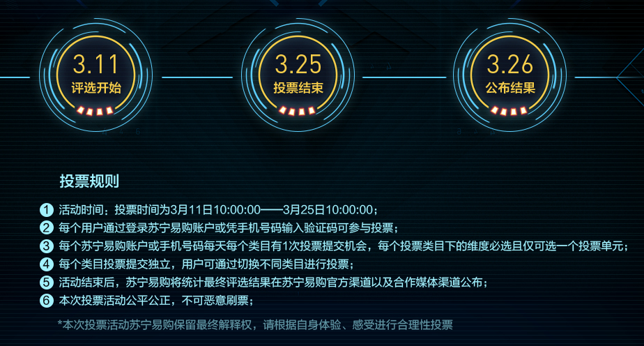 3月11日用戶投票評選開始,3月25日投票結(jié)束,26日正式公布投票結(jié)果,活動貫穿蘇寧易購315全民煥新節(jié)期間,面對眾多手機、電腦、數(shù)碼新品,用戶會作何選擇?