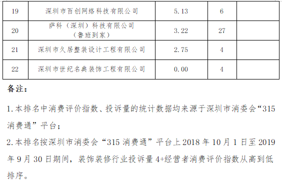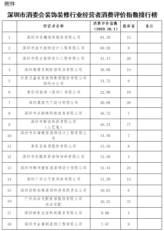 深圳市消委會發(fā)布裝飾裝修行業(yè)消費評價指數(shù)排行榜