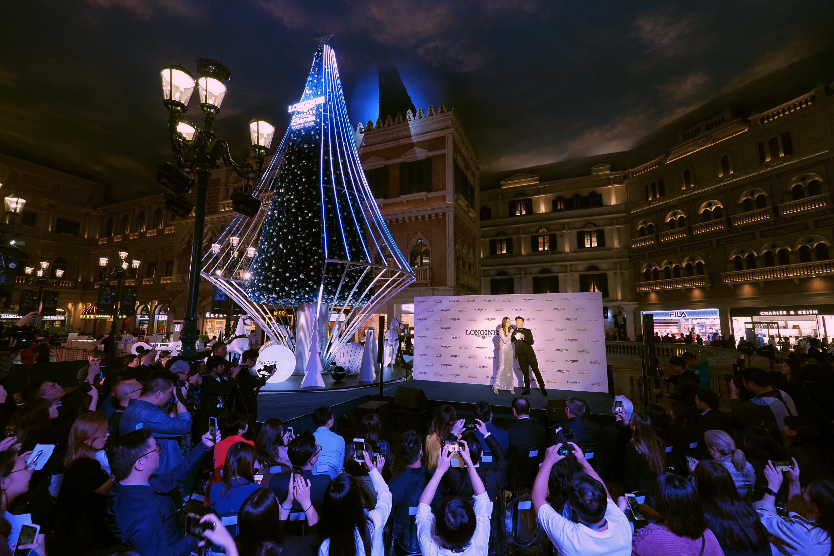 亮燈儀式于威尼斯人購(gòu)物中心圣馬可廣場(chǎng)舉行,影視明星鐘嘉欣受邀出席,并與浪琴澳門副總裁鄭美齡、金沙中國(guó)有限公司零售市場(chǎng)推廣副總裁Rita Simonetta及金沙中國(guó)有限公司商場(chǎng)管理部總監(jiān)梁俊強(qiáng)一同啟動(dòng)高達(dá)13米的藍(lán)色菱形圣誕樹底部的音樂(lè)盒裝置。