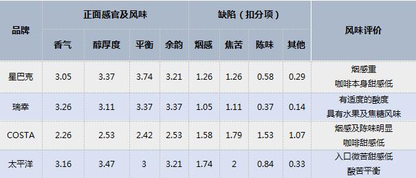 而20位咖啡達人對4款美式咖啡的整體風味評價也不盡相同:瑞幸有適度的酸度,具有水果及焦糖風味,接受程度最高;星巴克煙感重,咖啡本身甜感低;COSTA煙感及陳味明顯,酸酐較強,咖啡甜感低;太平洋入口微苦甜感低,酸苦較平衡。