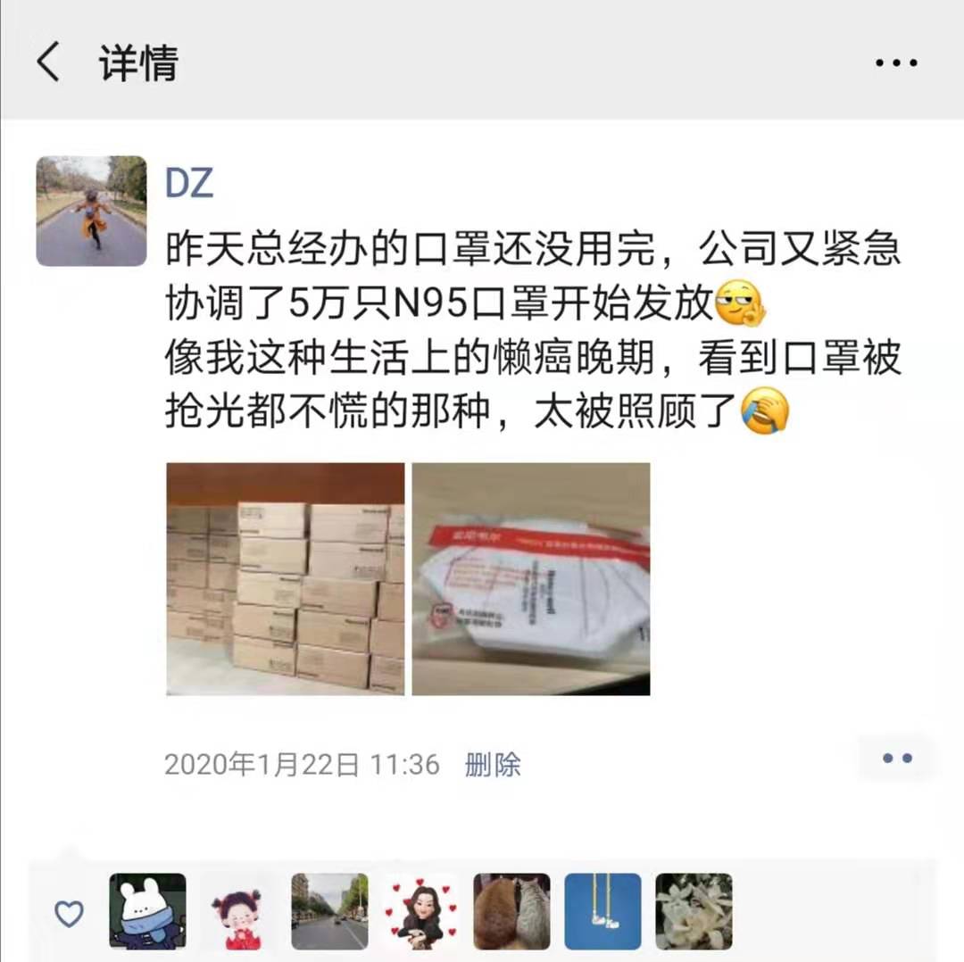 春節(jié)放假前夕,疫情形勢陡然嚴峻。在蘇寧南京總部工作的小丁清楚地記得,1月2 2 日那天,她在上班的路上,看到戴口罩的人多了起來,還和小伙伴念叨著也要趕緊買些。結(jié)果,當天上午,部門就給每人發(fā)了一個全新的N9 5 口罩,讓她倍感驚喜和暖心。原來,蘇寧總部緊急調(diào)集了5萬個口罩發(fā)到員工手中,各大區(qū)也紛紛緊急調(diào)貨給員工發(fā)放。自稱“懶癌晚期”、平時連朋友圈都很少發(fā)的她,忍不住發(fā)圈為公司點贊。