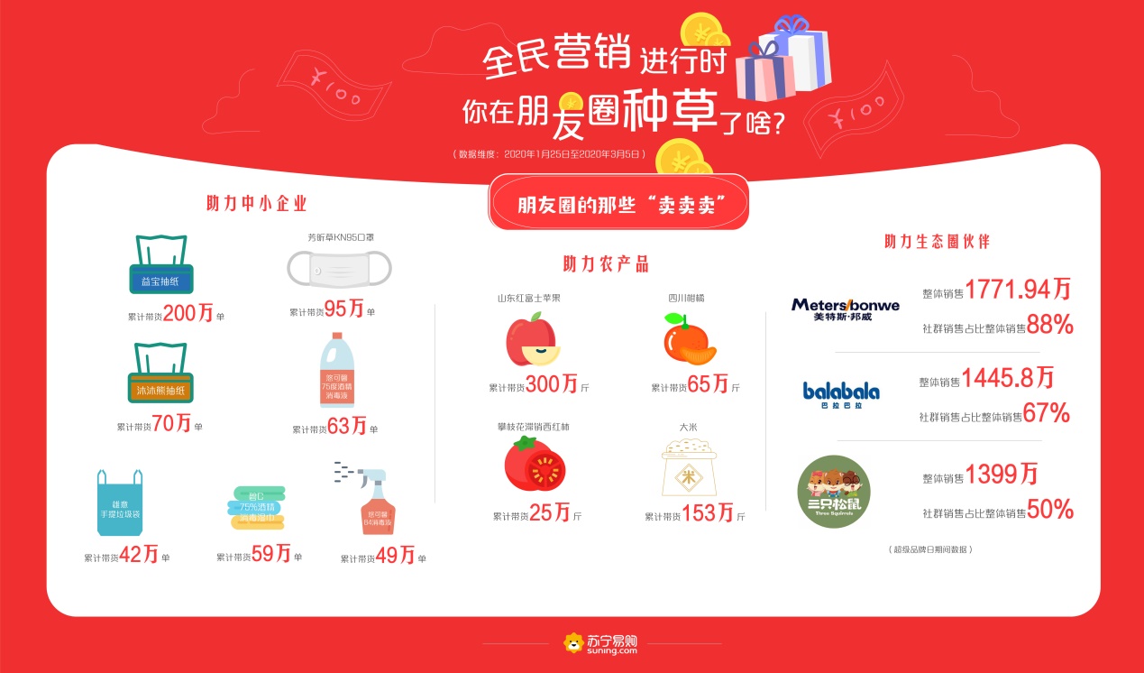 近日,蘇寧易購發(fā)布全民營銷大數(shù)據(jù),2020年1月25日至3月5日,蘇寧推客買家數(shù)和賣家數(shù)分別突破千萬、百萬大關,80后成為朋友圈買、賣“雙主力”,糧油休食、個護家清、生鮮等產品成為最受歡迎的消費品類。