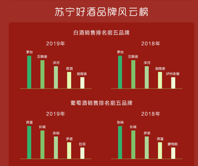 對比2018年各品牌在蘇寧的銷售表現(xiàn),則是穩(wěn)坐釣魚臺(tái)的品牌有之,長江后浪推前浪的品牌有之。具體來說,茅臺(tái)、五糧液、洋河一直牢牢占據(jù)白酒品類銷售榜前三。在紅酒方面,奔富后來者居上,從2018年的第四位躍居第一位。啤酒方面,雪花、哈爾濱、青島、百威、福佳的排名無變動(dòng),而洋酒方面,馬爹利一直穩(wěn)坐第一。古越龍山也一直是黃酒品牌銷售top1。