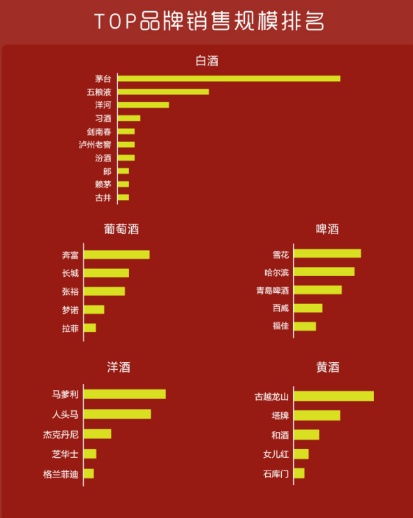 具體來說,從蘇寧超市公布的品牌銷售規(guī)模排行榜來看,茅臺(tái)、五糧液、洋河、習(xí)酒、劍南春、瀘州老窖、汾酒、郎酒、賴茅、古井成為當(dāng)之無愧的白酒品類銷售top10品牌。奔富、長城、張?jiān)!糁Z、拉菲則成功問鼎葡萄酒銷售top5,雪花、哈爾濱、青島、百威、福佳在啤酒品類中銷售表現(xiàn)最好。馬爹利、古越龍山則分別成為洋酒、黃酒品類銷售冠軍。