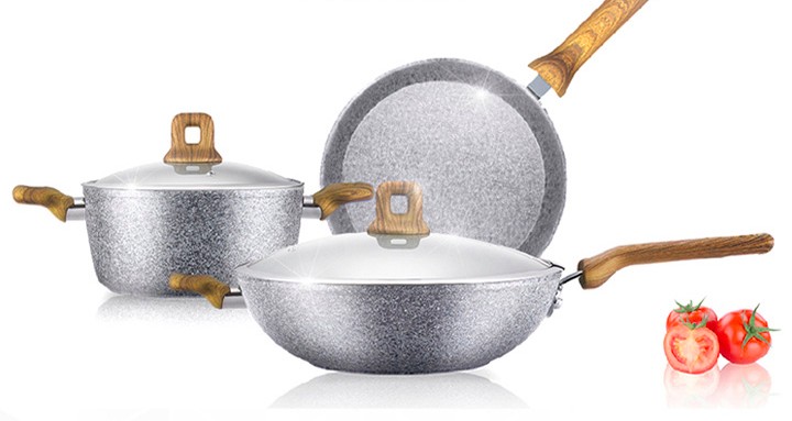 滿足炒、煎、燉多種需求,一套高品質(zhì)、高顏值的鍋具相信你一定不會拒絕。三禾鍋具三件套 T606是膳石犀利花崗巖健康不粘鍋,采用花崗巖納米起點,不粘更持久,耐磨性更高,堪稱品質(zhì)首選。除此之外,其還擁有五層技術(shù)工藝,并采用一體成型設(shè)計,質(zhì)量顏值雙升級。原木紋手柄,防霉防燙;鋼化玻璃蓋,密封防溢;節(jié)能復(fù)合底受熱均勻。三件套內(nèi)包含炒鍋、煎鍋、燉鍋。