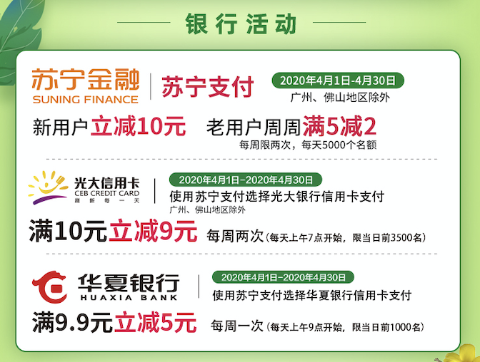 蘇寧小店為418大促亦開啟福利,用蘇寧支付新老用戶可享支付立減,每周滿減、新人券包以及華夏、光大銀行信用卡滿減等優(yōu)惠福利。即日起至4月30日,新用戶在蘇寧小店門店使用蘇寧支付消費(fèi)享受立減10元優(yōu)惠,蘇寧小店全場(chǎng)大牌3折起,更多爆款可下載蘇寧小店APP,隨時(shí)到家,近在身邊。