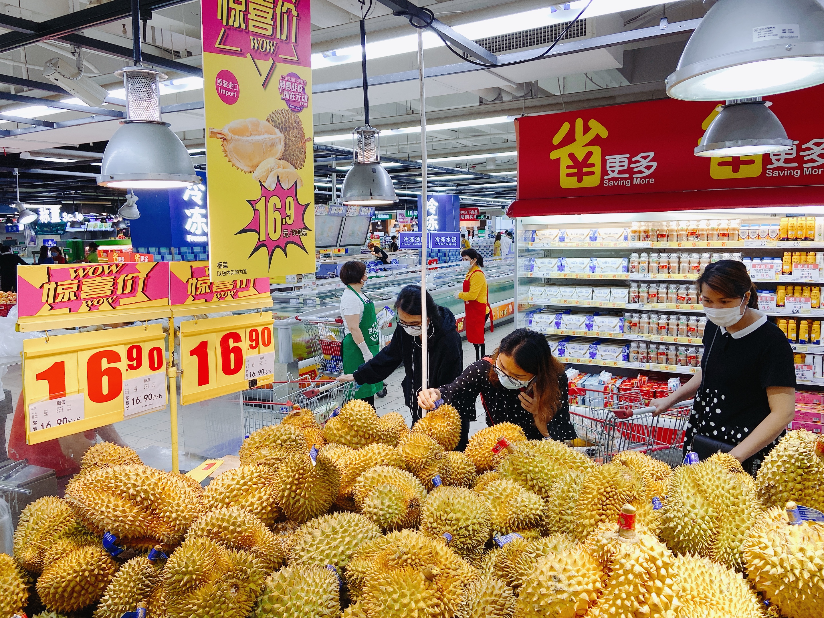 4月19日,記者來(lái)到家樂(lè)福一門店實(shí)地探訪。剛一步入生鮮區(qū)域,便被“泰國(guó)進(jìn)口榴蓮,白菜價(jià)16.9一斤”的促銷口號(hào)所吸引。整個(gè)生鮮區(qū)不乏各色接地氣的促銷口號(hào),吆喝聲此起彼伏,吸引不少消費(fèi)者駐足選購(gòu)?!皠偵鲜械奶﹪?guó)金枕頭,你看這個(gè)個(gè)頭、還有這個(gè)味道你聞聞,(每斤)只要16.9,比我們小區(qū)附近的生鮮超市還便宜”,一位受訪者對(duì)高性價(jià)比的泰國(guó)榴蓮贊不絕口。此次探店,記者聽(tīng)到消費(fèi)者最多的反饋是“品質(zhì)更好了,品種更多了”。家樂(lè)福深諳消費(fèi)者的需求,想要促進(jìn)消費(fèi),首先要給消費(fèi)者提供更多更好的選擇?!拔覀冞@次推出的’四月品鮮季’活動(dòng),有來(lái)自泰國(guó)、菲律賓等東南亞國(guó)家的反季水果,也有來(lái)自巴西、湖北的水產(chǎn)肉類。16.9元一斤的泰國(guó)金枕榴蓮、4.9元一斤的菲律賓切割蕉、25.9元一斤的湖北清水稻田蝦這幾天一直占據(jù)暢銷榜前三的位置”,該店負(fù)責(zé)人介紹。