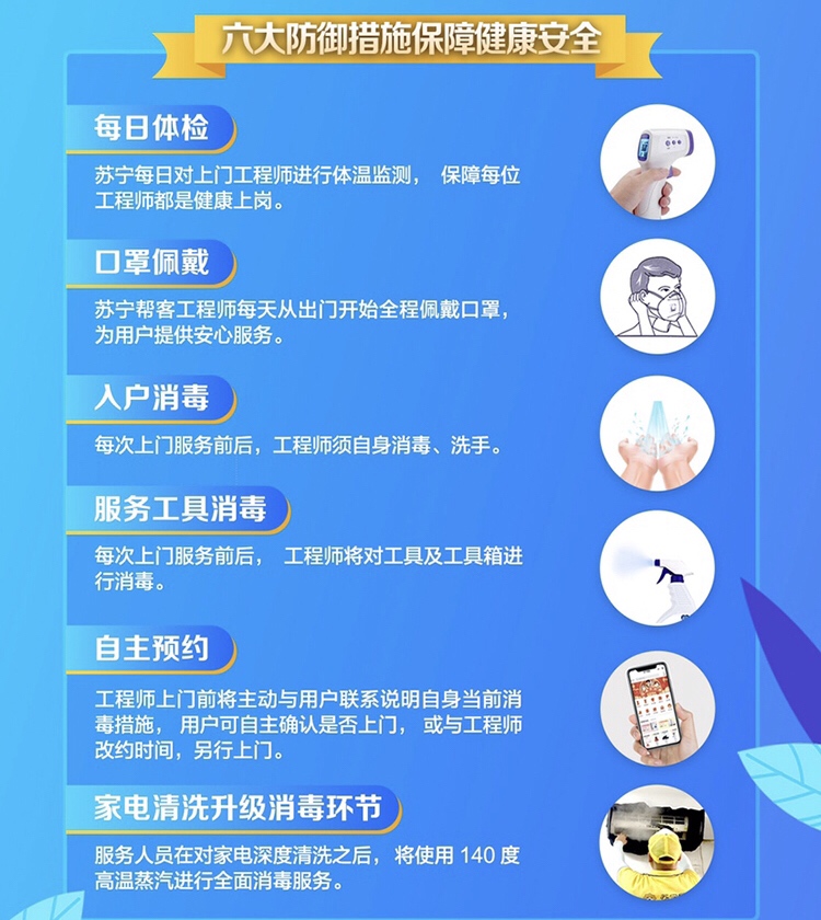 據(jù)了解,該承諾卡是蘇寧創(chuàng)建,主要承諾內(nèi)容包括服務(wù)前的體溫檢測、工具消毒、個人防護(hù);服務(wù)中的工程師全防護(hù)、工具不落地、與用戶保持安全距離;服務(wù)后的機(jī)器清潔、線上保修減少上門以及清理服務(wù)現(xiàn)場。
