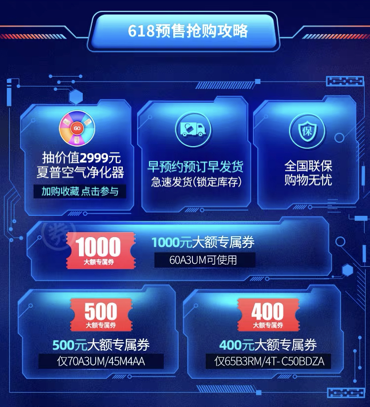 本消費者參與預(yù)付,100元定金膨脹最高達1.5倍,滿滿誠意助力預(yù)售。此外若消費者參與搶先付定,還能獲得最高價值1199元的專屬大禮包,包含從夏普音響到優(yōu)酷年卡在內(nèi)7重好禮助力預(yù)售!優(yōu)惠之外,夏普還驚喜設(shè)置加購收藏環(huán)節(jié),消費者參與抽獎即有機會獲得高達2999元的超實用夏普空氣凈化器。更多大促信息可前往天貓夏普官方旗艦店了解詳盡618預(yù)售搶購攻略。