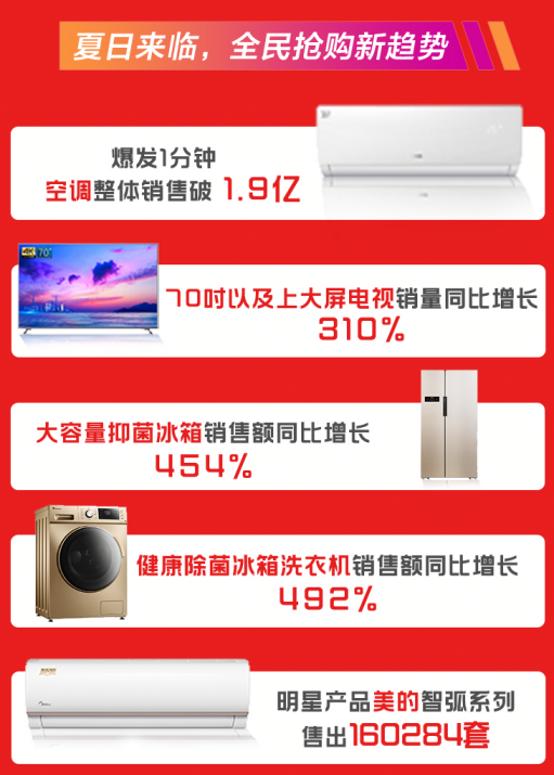 在品類表現(xiàn)上,空調(diào)、冰洗、彩電銷售火熱。爆發(fā)1分鐘,空調(diào)整體銷售破1.9億,明星產(chǎn)品美的智弧系列18小時(shí)售出160284套;截至18時(shí),健康除菌冰箱洗衣機(jī)銷售額同比增長(zhǎng)492%。