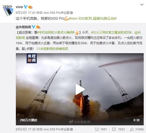 見(jiàn)圳客戶端 ·深圳新聞網(wǎng)2020年6月28日訊 北斗系統(tǒng)第五十五顆導(dǎo)航衛(wèi)星暨北斗三號(hào)最后一顆全球組網(wǎng)衛(wèi)星,6月23日9時(shí)43分成功發(fā)射。為了多角度拍攝火箭點(diǎn)火,央視新聞在導(dǎo)流槽附近架設(shè)多臺(tái)vivo X50 Pro手機(jī),一臺(tái)位于導(dǎo)流槽旁邊,距離火箭10米的位置,用于拍攝點(diǎn)火近景;兩臺(tái)架設(shè)在導(dǎo)流槽后方30米的距離,用于拍攝點(diǎn)火中景,以及點(diǎn)火后的蒸汽場(chǎng)景。