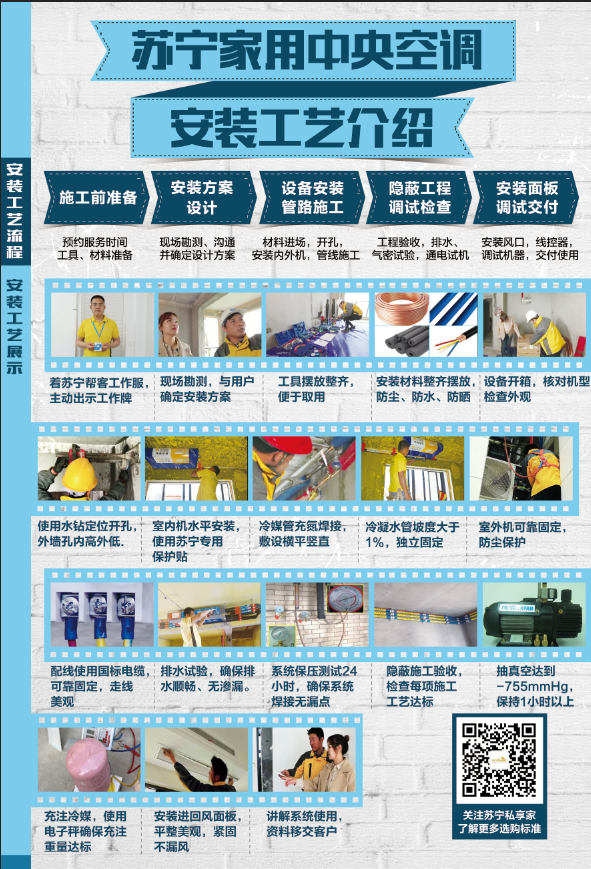 蘇寧中央空調(diào)以《安裝綠寶書》的形式,從“人、材、技”三方面規(guī)定蘇寧施工“365標(biāo)準(zhǔn)”,細致展示了蘇寧中央空調(diào)的施工流程和具體工藝,包括安裝工程師的職業(yè)行為、施工現(xiàn)場的規(guī)范、安裝工具的要求、安裝材料的標(biāo)準(zhǔn),以及整個安裝過程的嚴苛工藝標(biāo)準(zhǔn)和調(diào)試環(huán)節(jié)等諸多方面。五大工序,涉及18個步驟,為消費者全面解讀中央空調(diào)標(biāo)準(zhǔn)化施工的“秘密”。