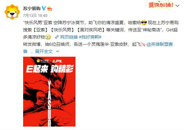 昨日,蘇寧易購(gòu)官方微博發(fā)布消息稱,英雄聯(lián)盟職業(yè)聯(lián)賽(LPL)代言人亞索亮相蘇寧冰爽節(jié),將和蘇寧“E起”為廣大用戶及粉絲創(chuàng)造快樂(lè)。
